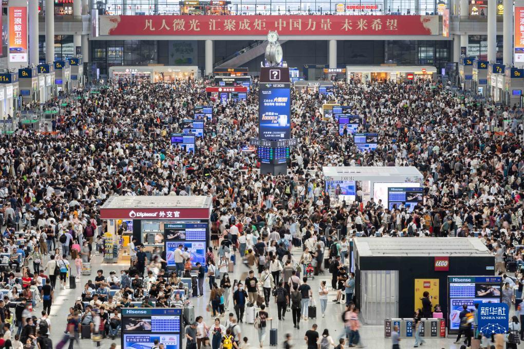 10月1日,上海虹橋火車站候車大廳裏人頭攢動。