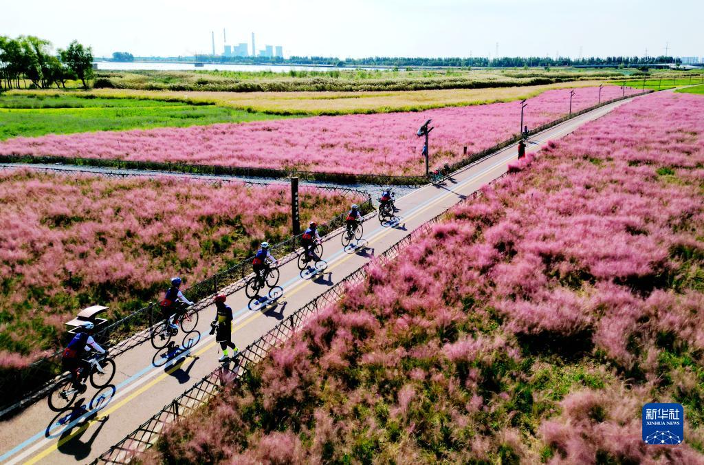 10月1日,騎行愛好者在山東省東營市東營區耿井濕地粉黛亂子草區騎行,欣賞濕地風光。