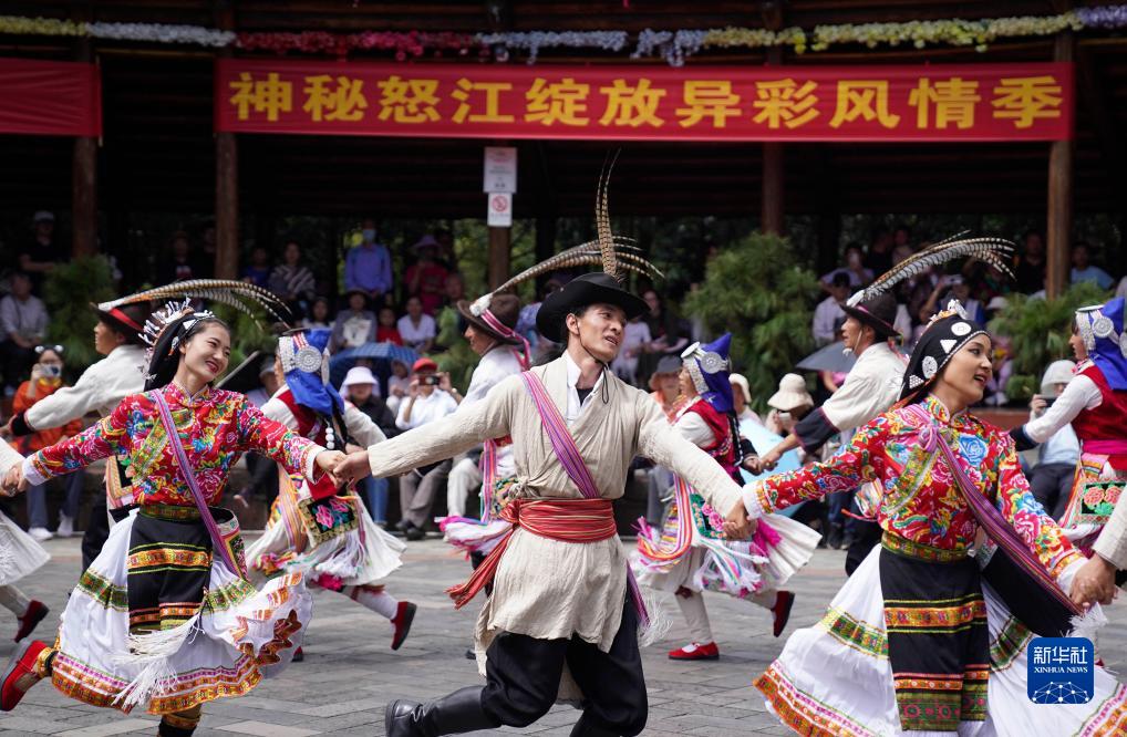 10月1日,游客和演員在雲南省昆明市的雲南民族村一起歡度節日。