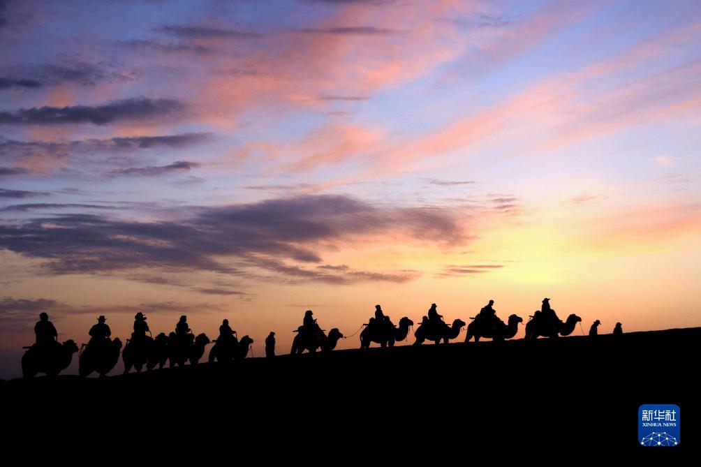 10月1日,在甘肅省敦煌市鳴沙山月牙泉景區,游客在晨光中騎駱駝游覽。