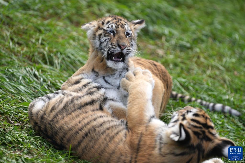 10月1日,橫道河子東北虎林園的幼虎在草地上玩鬧。
