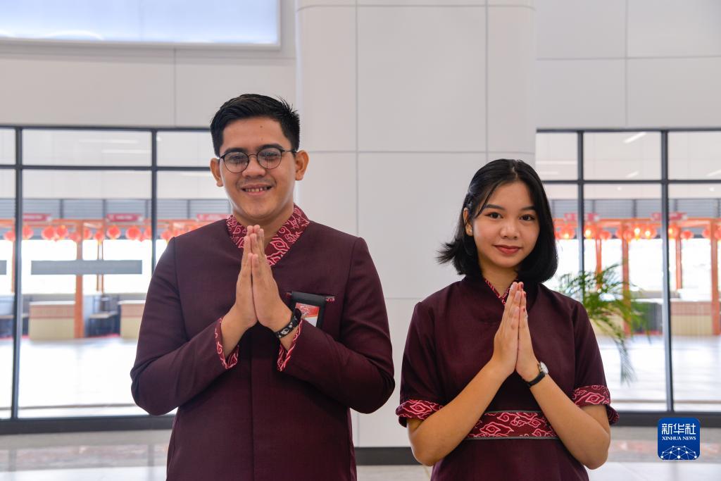 10月2日,在印度尼西亞雅加達哈利姆車站,乘務人員歡迎乘客和嘉賓。