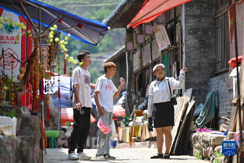 在山西磧口古鎮,導游張珍花(右)為游客講解古鎮歷史(8月2日攝)。村民張珍花2006年開始從事磧口古鎮導游工作。