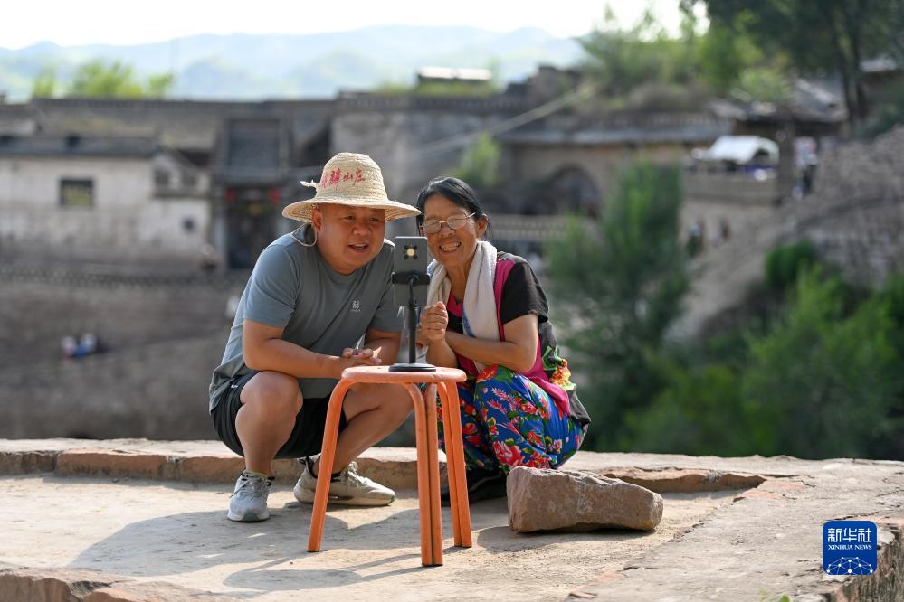 村民陳玉香(右)和兒子李彥軍在直播(8月2日攝)。2021年,陳玉香開始嘗試在網上直播介紹磧口古鎮的美景和美食,很快收穫了20多萬粉絲。