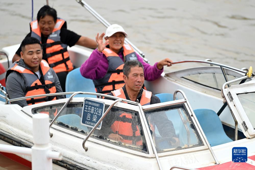 在山西磧口古鎮,村民張保生(前)駕駛快艇在黃河上行駛(9月26日攝)。張保生以前以擺渡為生,開的是木船和鐵船,2000年考了快艇駕駛證。如今,他農忙時種地,農閒時開快艇帶着游客在黃河上觀光,一年能收入3萬多元。