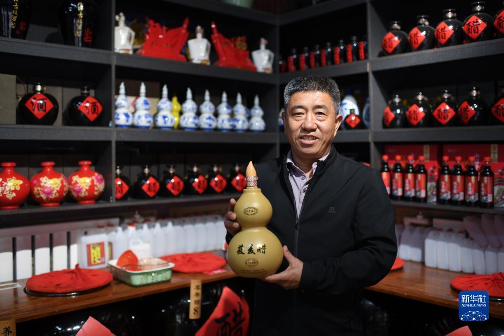在山西磧口古鎮,張海龍在展示醋産品(9月26日攝)。張海龍之前是卡車司機,2018年,他在磧口古鎮開了一家山西陳醋店,吸引不少游客光顧。