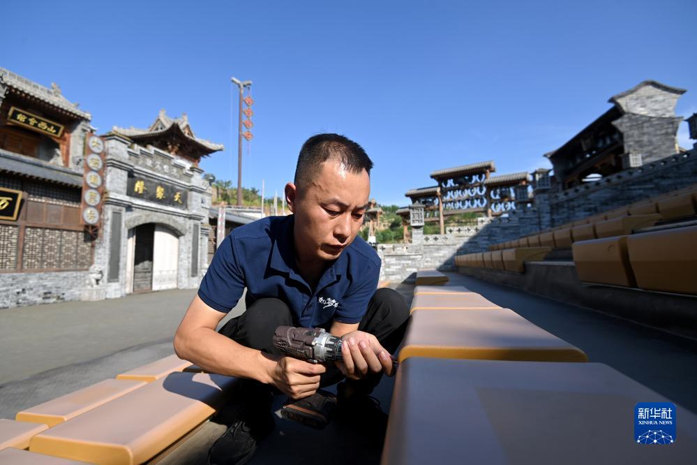 村民李探恩在《如夢磧口》劇場忙碌(8月2日攝)。李探恩之前在外打工,2020年9月《如夢磧口》在磧口開演後,他來到劇場做場務工作,每年有5萬多元的收入。