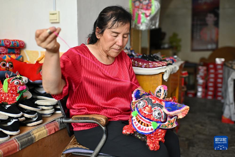 在山西磧口古鎮,村民馮延愛在製作布老虎(8月2日攝)。近年來,到磧口古鎮觀光的游客越來越多,馮延愛製作的布老虎和布鞋得到游客的青睞。靠銷售布老虎和布鞋,馮延愛一年收入3萬多元。