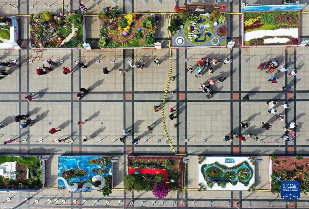 10月2日,市民和游客在石家莊市首屆園林“微景觀”製作大賽成果展上參觀(無人機照片)。