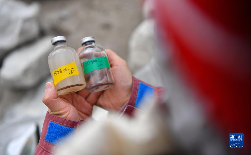 科考隊員查看採集到的水樣,通過水樣可以觀測到湖水釋放的甲烷、二氧化碳等氣體的濃度(10月1日攝)。
