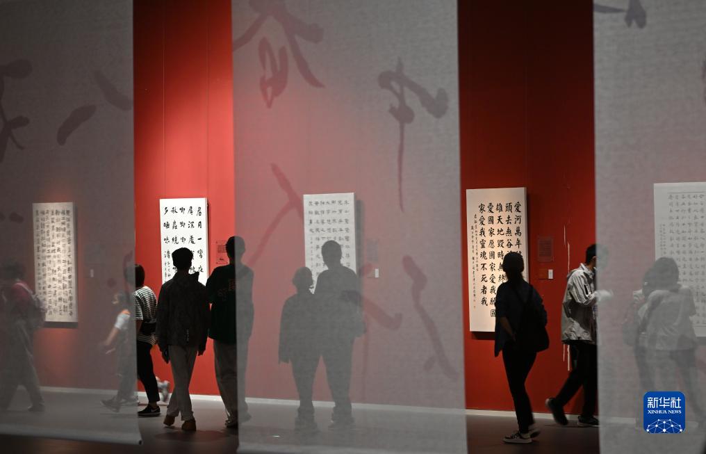 10月2日,參觀者在天津美術館觀看《春游——李叔同歌詞書法邀請展》。