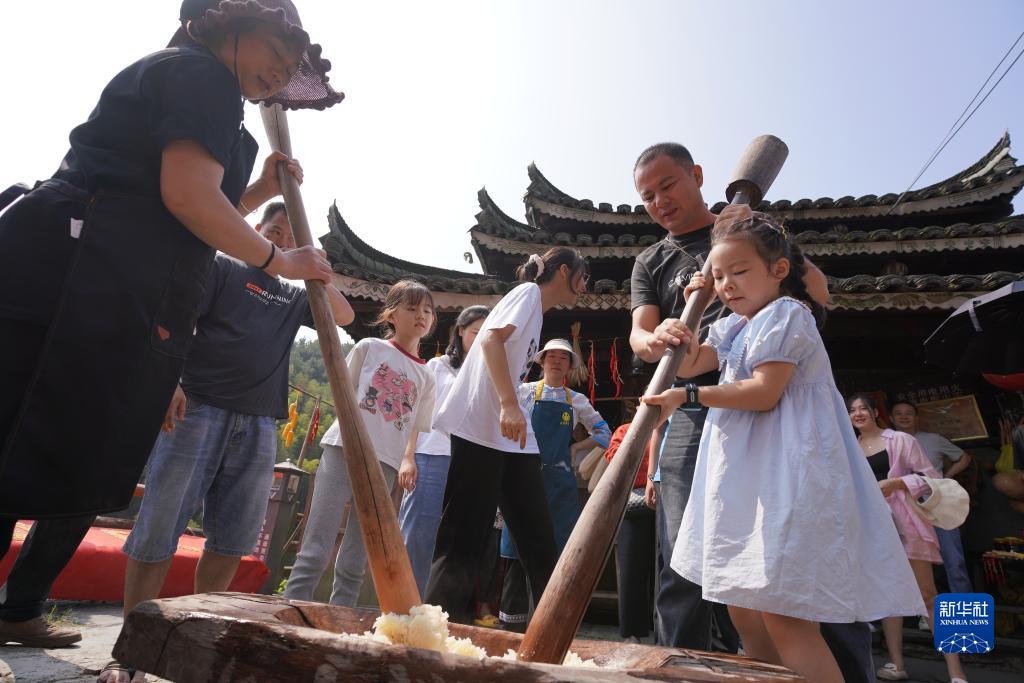 10月2日,游客在湖南省懷化市通道侗族自治縣雙江鎮芋頭村體驗打糍粑。