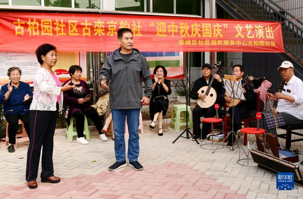 10月2日,戲迷票友在河北省石家莊市欒城區古柏園社區進行“迎中秋慶國慶”自娛自樂文藝演出。