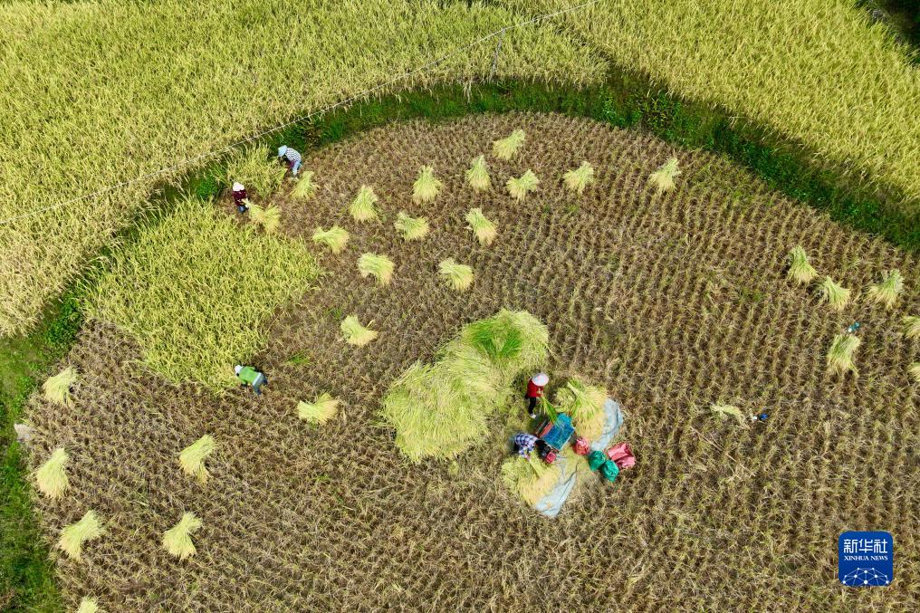 10月2日,福建省永泰縣白雲鄉村民在收穫水稻(無人機照片)。