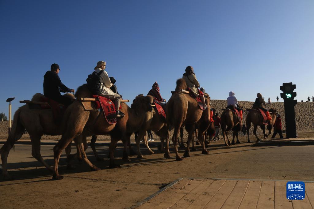中秋、國慶假期期間,甘肅省敦煌市鳴沙山月牙泉景區迎來旅游高峰。設置在景區內行人步道和駱駝通道交叉點的交通信號燈“駱駝紅綠燈”引導人、車和駱駝有序通行,確保了景區交通安全暢通。