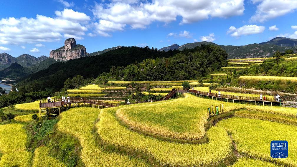 10月3日,游客在浙江省樂清市白石街道中雁村梯田間觀光(無人機照片)。