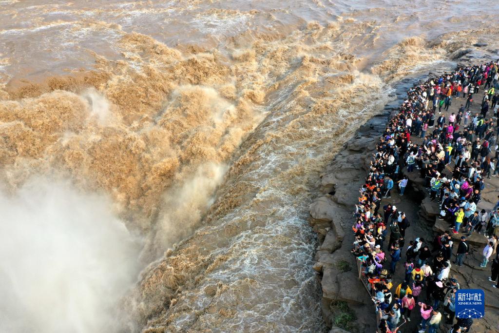 10月3日,游客在黃河壺口瀑布景區游覽(無人機照片)。