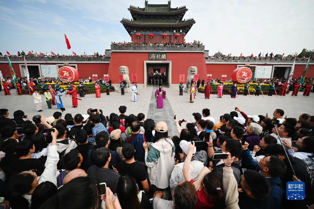 10月3日,游客在河南省開封市開封府門前觀看《開衙迎賓》儀式。