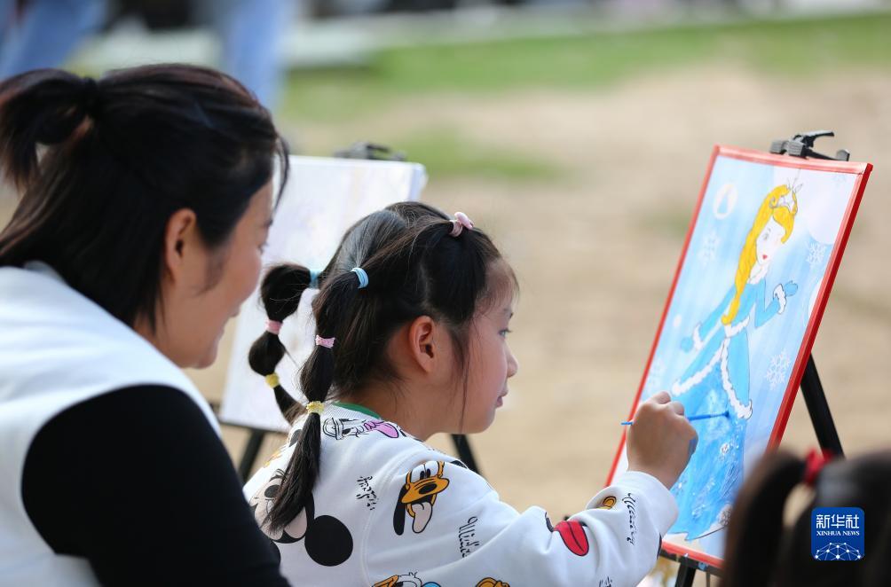 10月3日,家長陪着孩子在山東省滕州市弘道公園學習繪畫。