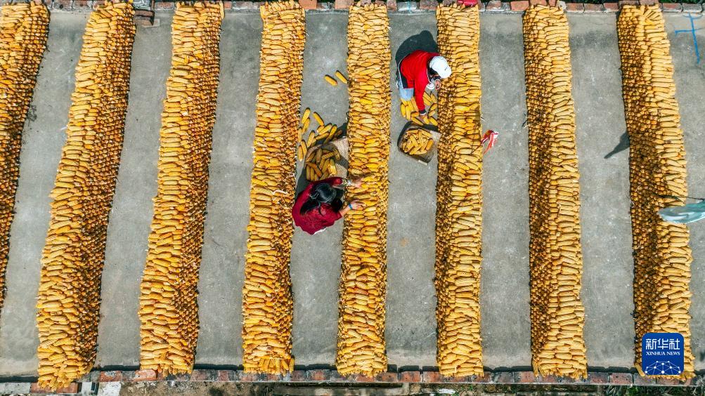 10月4日,河北省遵化市劉備寨鄉農民在碼放晾曬收穫的玉米(無人機照片)。