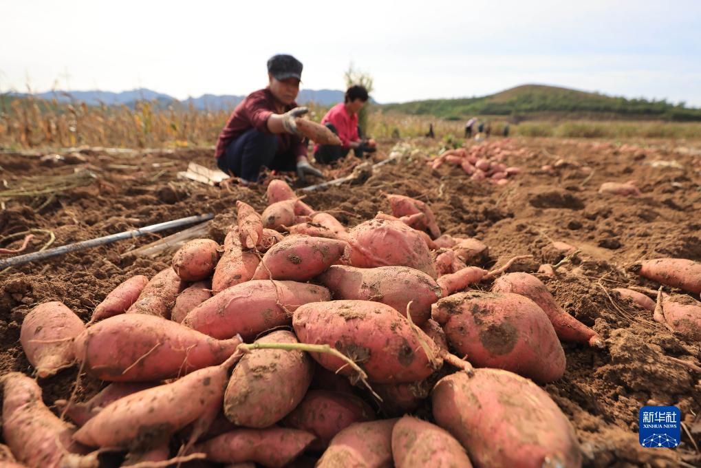 10月4日,河北省唐山市遷西縣新莊子鎮向陽村農民在收穫山地紅薯。