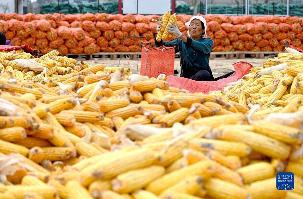 10月4日,河北省邯鄲市廣平縣廣平鎮南莊村的農民將玉米裝袋,準備晾曬。