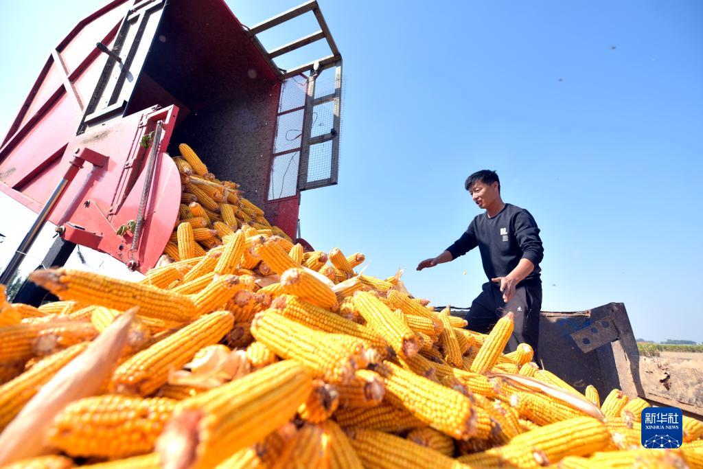 10月3日,在山東省聊城市茌平區賈寨鎮侯樓村,村民在田間收穫玉米。