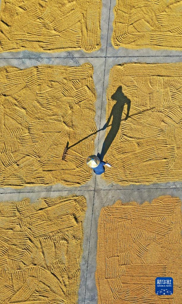 10月2日,在浙江省台州市仙居縣福應街道一企業內場地,農民在晾曬稻穀(無人機照片)。