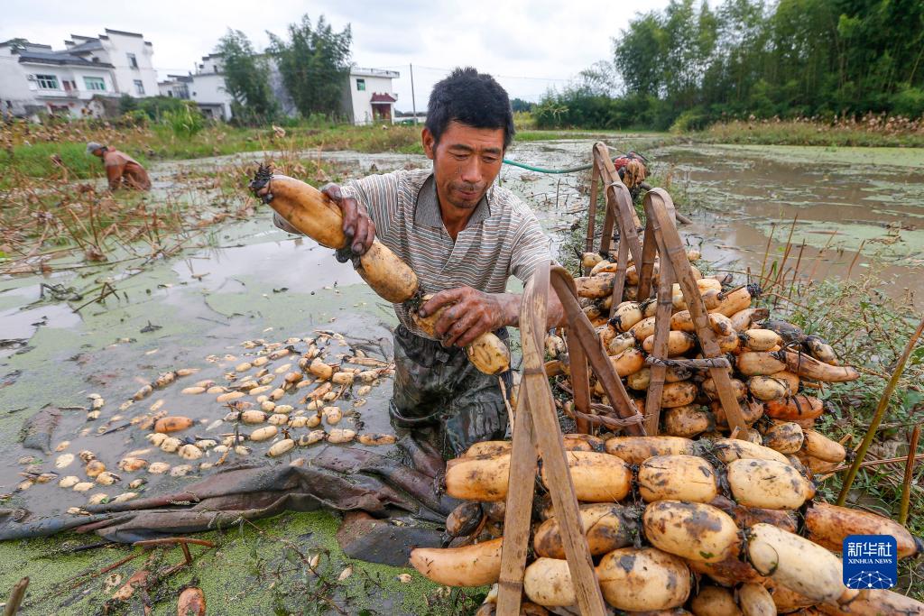 10月4日,村民在安徽省黃山市徽州區潛口鎮東山村採摘蓮藕。