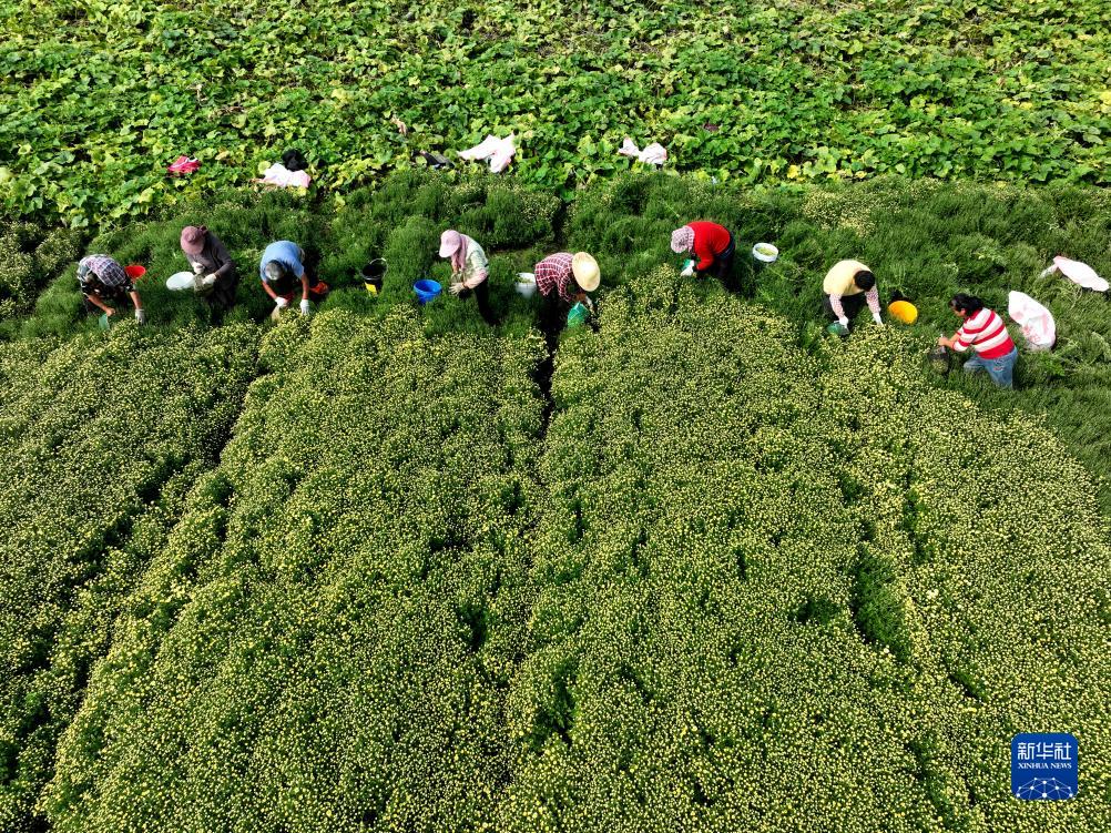 10月4日,在江蘇省鹽城市大豐區三龍鎮東紅村,村民採摘菊花(無人機照片)。
