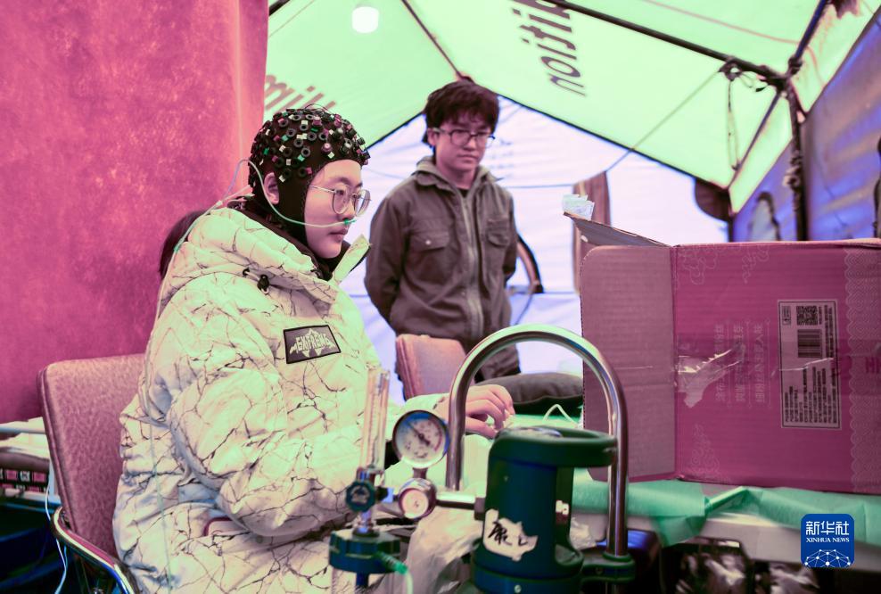 在卓奧友峰登山大本營,科考隊員(前)佩戴全腦彈性測試帽,測試有氧和無氧狀態下的人體認知能力(9月29日攝)。