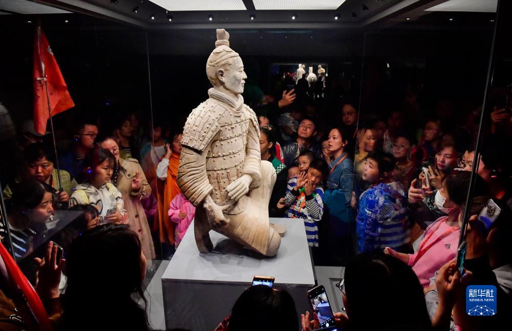10月4日,游客在秦兵馬俑二號坑遺址內參觀跪射俑。