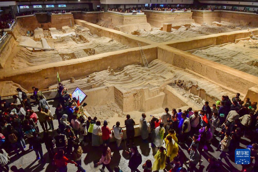 10月4日,游客在秦兵馬俑二號坑遺址參觀。
