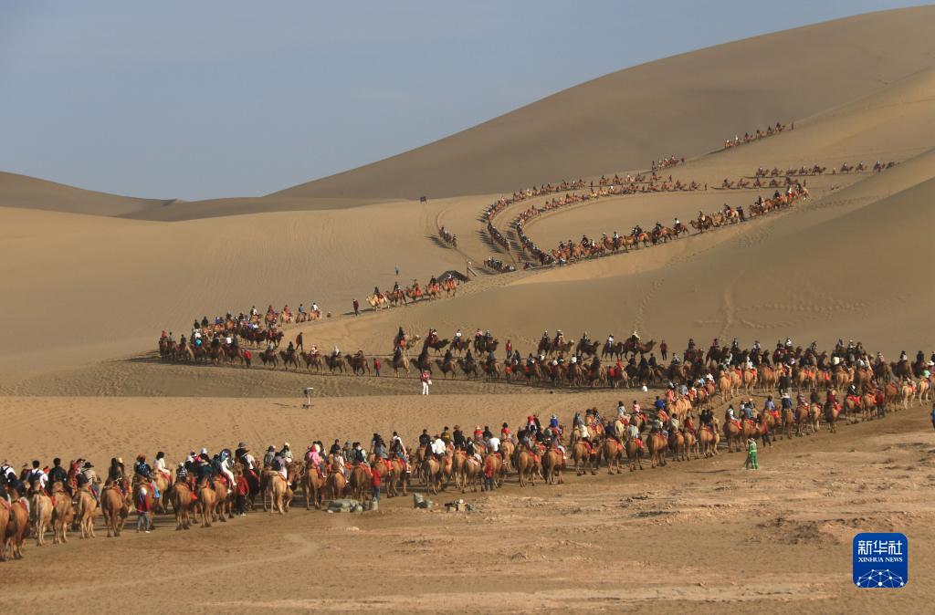 10月3日,游客在甘肅省敦煌市鳴沙山月牙泉景區游玩。