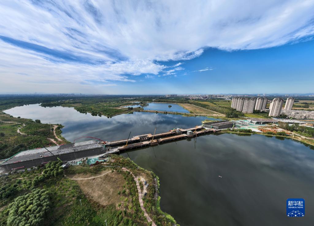 10月4日拍攝的廠通路潮白河大橋施工現場(無人機照片)。