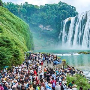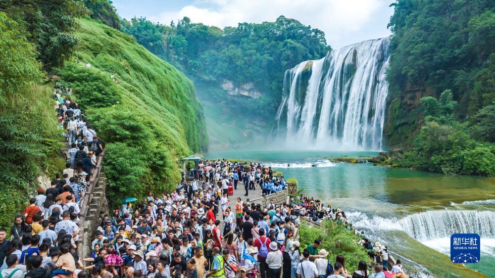 10月3日,游客在貴州省安順市黃果樹瀑布景區游玩(無人機照片)。