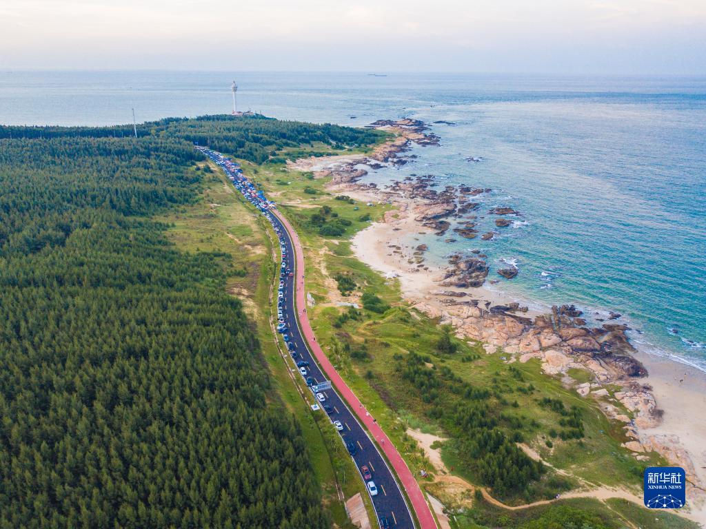 10月4日,海南環島旅游公路文昌段風景如畫,吸引了大批游客前來自駕游玩(無人機照片)。