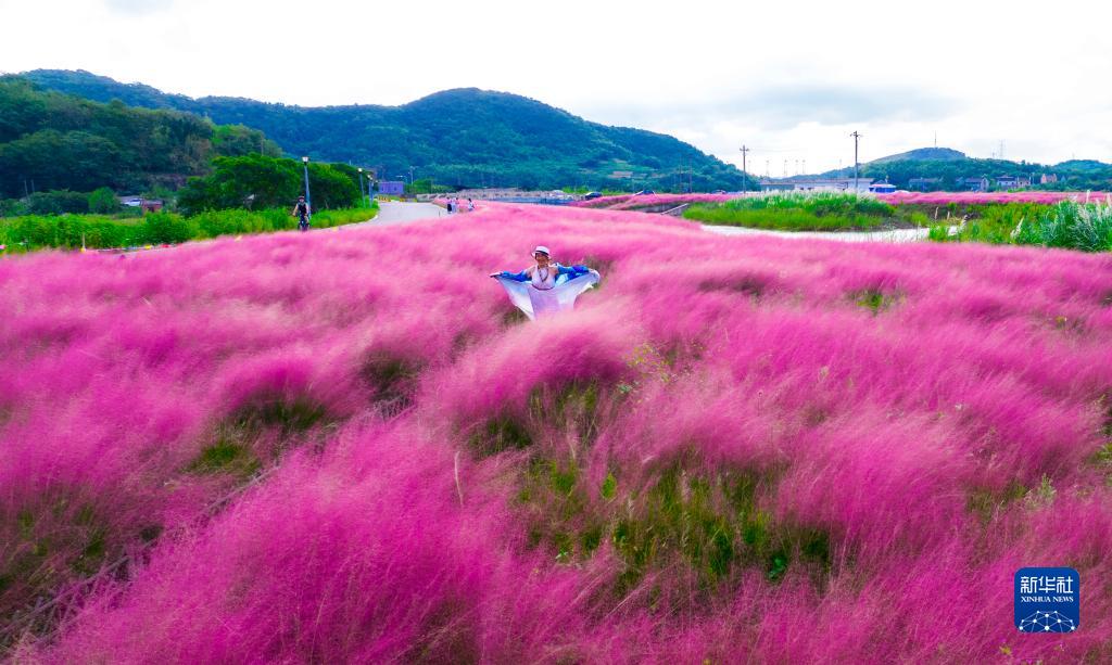10月4日,在浙江省寧波市北侖區梅山街道梅山灣水道沿線,游客在粉黛亂子草中游玩(無人機照片)。