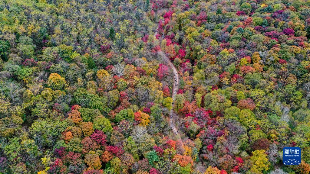 10月4日,游客在吉林省蛟河市紅葉谷景區游覽(無人機拍攝)。