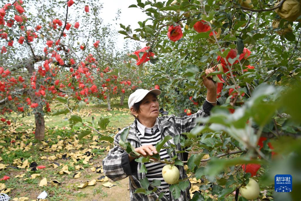 9月27日,宜川縣雲岩鎮太吉村果農在果園給蘋果摘袋。