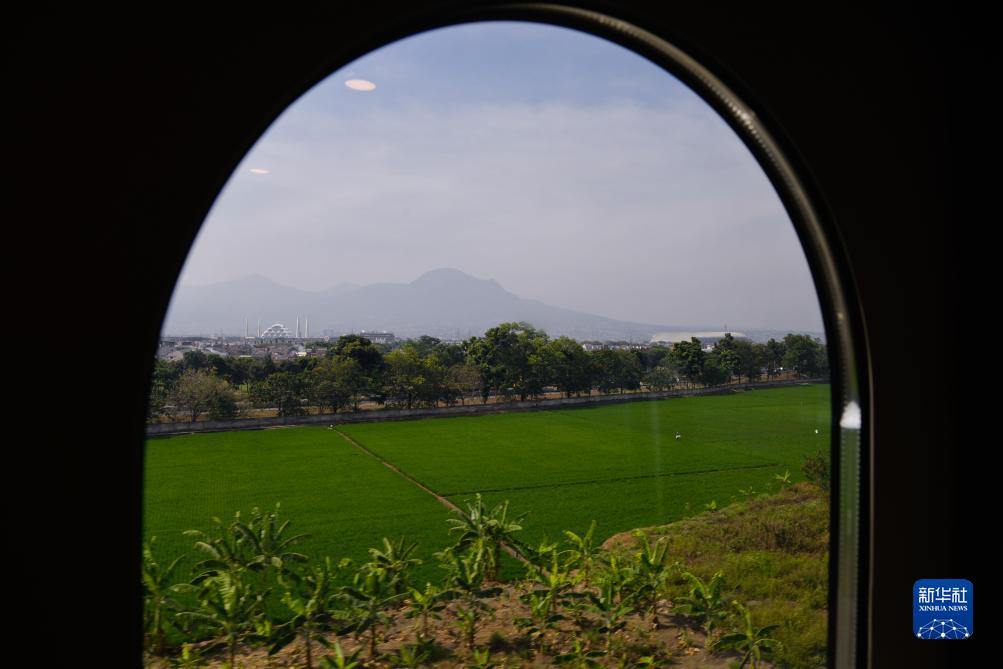 這是在印度尼西亞雅萬高鐵高速動車組上拍攝的車窗和窗外的萬隆風景(9月4日攝)。