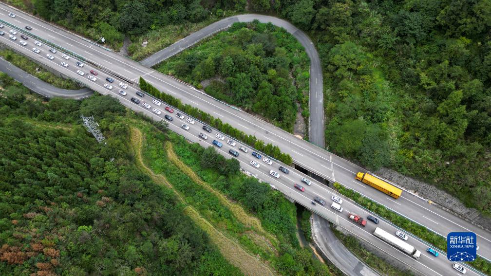 10月5日拍攝的廈蓉高速貴州省黎平縣雙江鎮境內返程車流(無人機照片)。