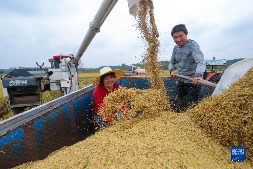 10月4日,在河南省信陽市光山縣羅陳鄉張樓村,一家合作社社員搶收水稻。