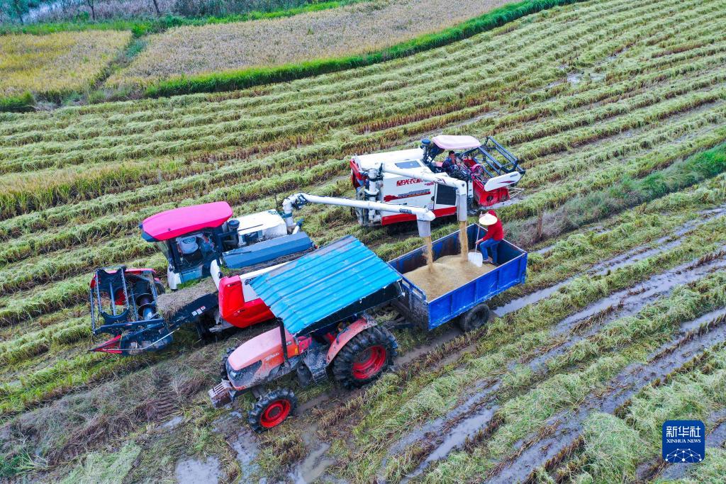 10月4日,在河南省信陽市光山縣羅陳鄉張樓村,收割機手操作機械將收穫的水稻裝車(無人機照片)。
