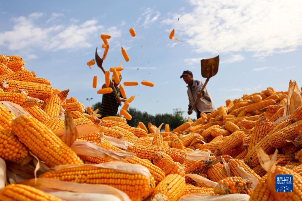 10月5日,在河北省石家莊晉州市周家莊鄉第七生産隊,農民在晾曬收穫的玉米。