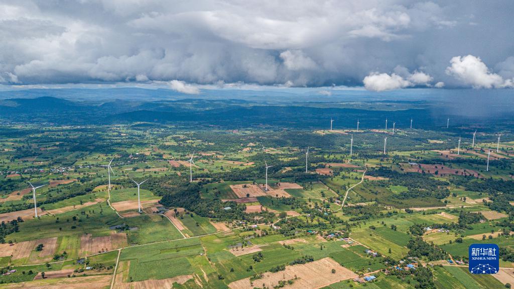 這是10月5日在泰國猜也蓬府拍攝的由中國金風科技提供的風力發電機(無人機照片)。
