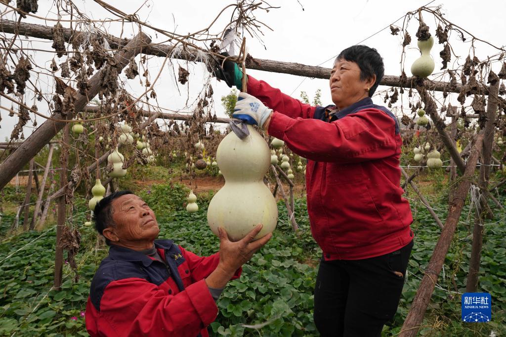 10月5日,河北省邢&市信都區會寧鎮張爾莊村村民在葫蘆園內採摘葫蘆。
