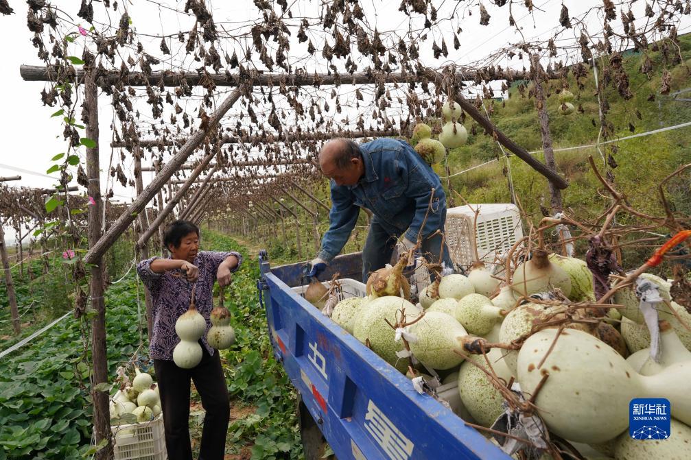 10月5日,河北省邢&市信都區會寧鎮張爾莊村村民在將剛采收的葫蘆裝車。