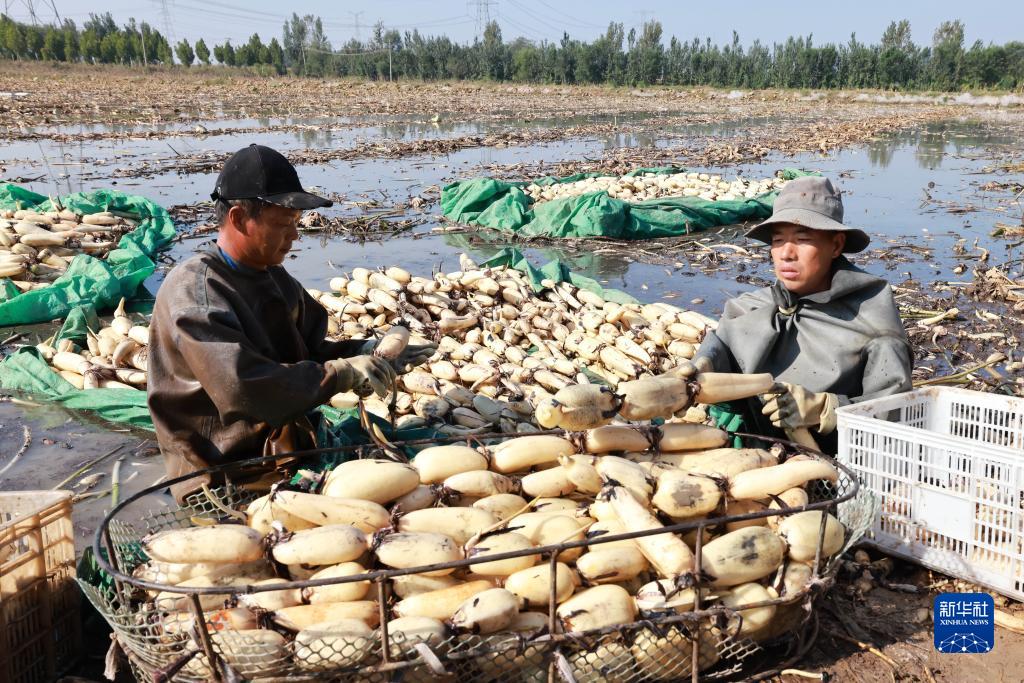 10月5日,河北省新河縣西流鄉西董村一家蓮藕種植合作社的社員在分揀收穫的蓮藕。