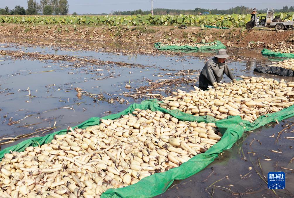 10月5日,河北省新河縣西流鄉西董村一家蓮藕種植合作社的社員在收穫蓮藕。